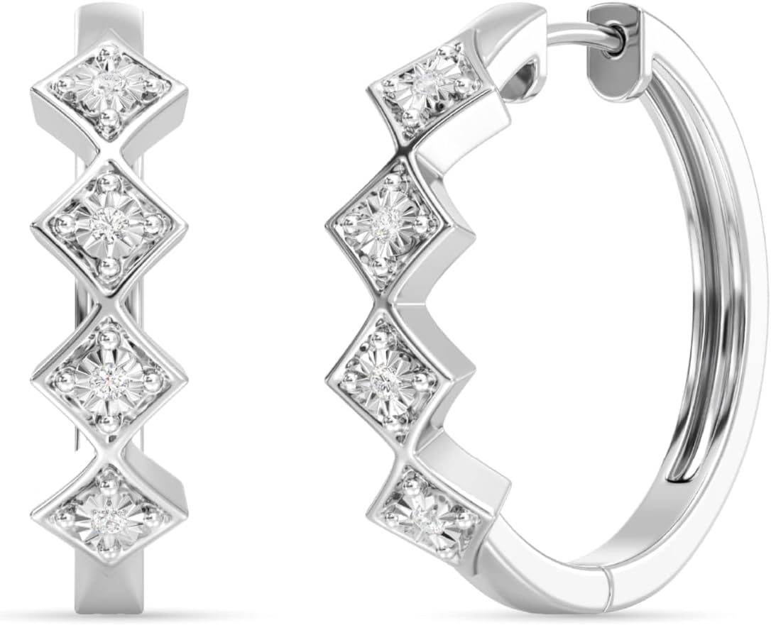 "Elevate your everyday look with Gilded's range of lightweight hoop earrings featuring brilliant cut lab-grown diamonds with a total weight of 1/10 carat set in round hoops of 925 sterling silver. The ethically sourced square shaped diamonds in SI1 clarity and F color bring together dazzling brilliance and timeless elegance. Made for the modern woman who embraces sparkle with intention, these silver hoop earrings deliver just the right touch of brilliance. Stylish, durable, and responsibly crafted, they fuse contemporary glamour with conscious design. Their lightweight, compact form makes them comfortable enough to wear all day and even through the night. The secure hinged closure ensures they stay effortlessly in place. Designed to be hypoallergenic and irritation-free, these silver earrings are ideal for those with sensitive skin. Whether you are at the office, adding polish to your everyday look, or celebrating a joyous occasion, these earrings are crafted to elevate every moment with lasting brilliance. Presented in an elegant gift box, these earrings make a meaningful gift for birthdays, anniversaries, or any special occasion - an expression of grace, love, and conscious beauty."