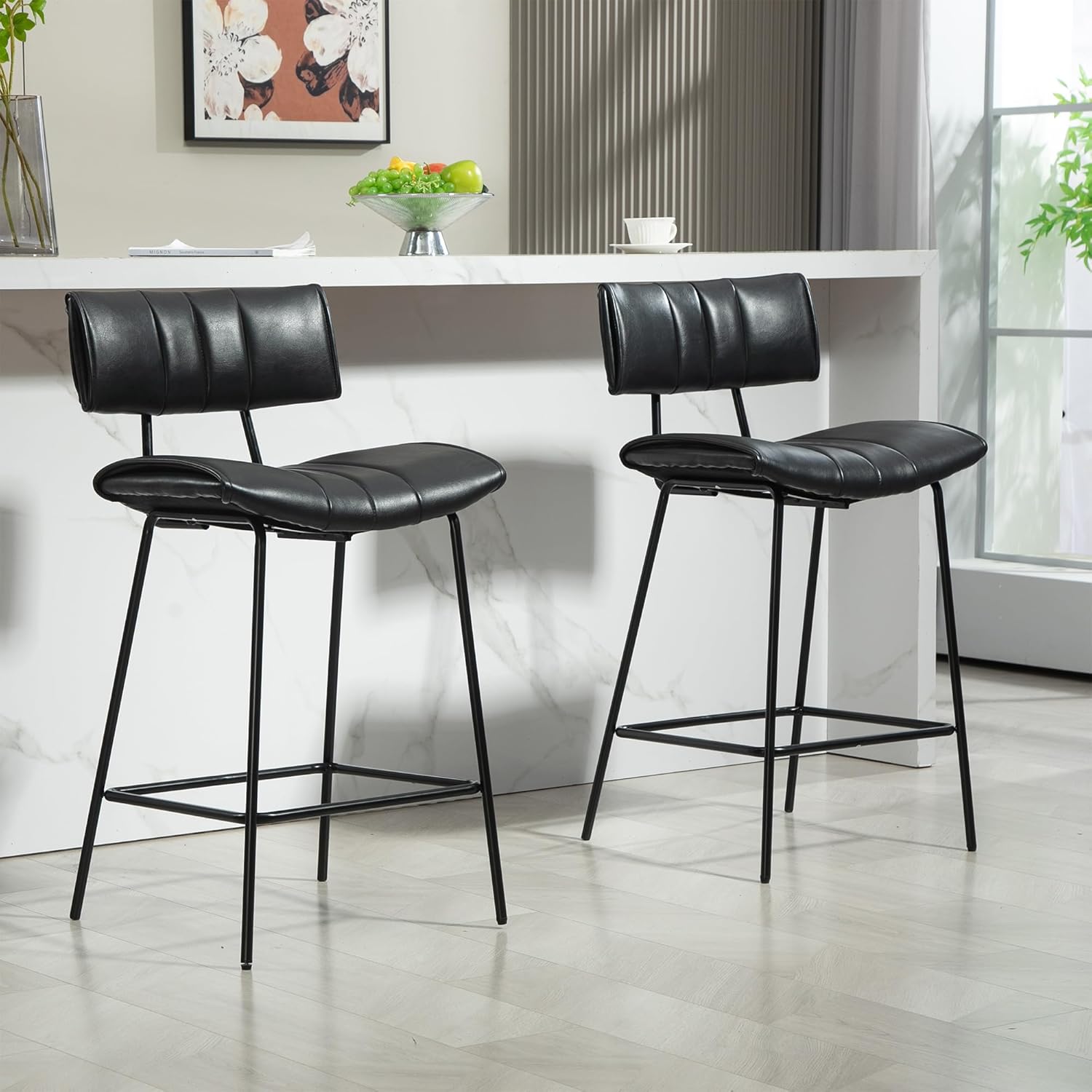 Experience elevated seating with our black faux leather counter stool, a perfect fusion of style and functionality. The sleek design is complemented by durable black iron legs, ensuring stability and a touch of mid-century modern charm. Enjoy added comfort with a strategically placed footrest, making it an ideal choice for both contemporary and classic bar settings. Redefine your bar area with this chic and practical seating solution. Product Dimensions: Overall: 19.3"W x 18.5"D x 36.2"H Weight: 14.11 LBS Seat: 19.3"W x 13.8"D x 25.6"H. Other Dimensions: Back Dimensions: 17.3"W x 12.6"H.