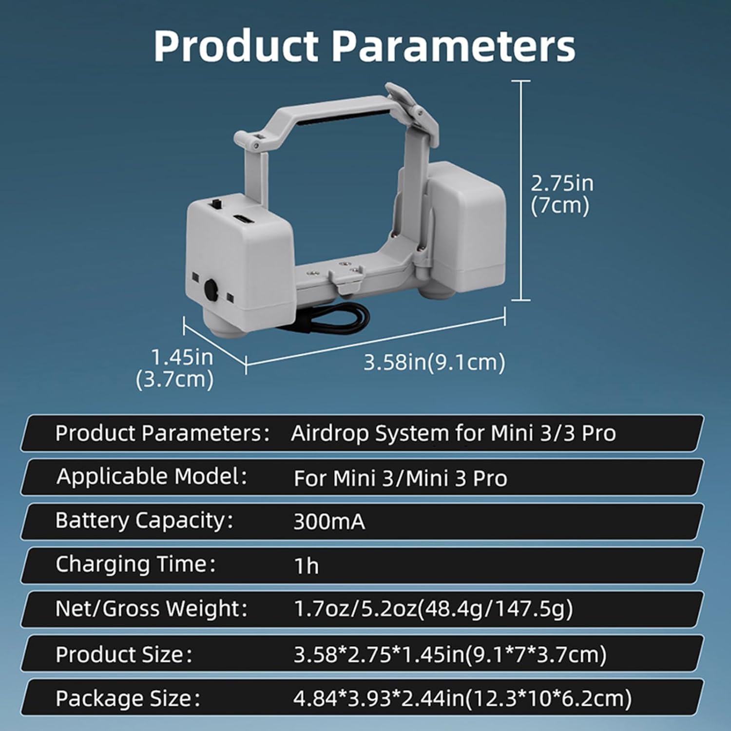 Specifications:Material: ABSColor: GrayMaximum Weight: 100 gBuilt-in Battery Capacity: 300 mAhSelf-charging Time: 1 hourProduct Size: 9.1x 7x 3.7cmPacking Size: 12.3x 10x 6.2cmWeight: 180gQuantity: 1 SetApplicable Model: for DJI MINI 3/3 PROPackage:1x Thrower + 1x Remote Control + 1x Charging Cable + 1x Hanger Cable + 2x Ring + 1x Instruction ManualNote:Due to the different light, the angle and the display, the image may not reflect the actual color of the project